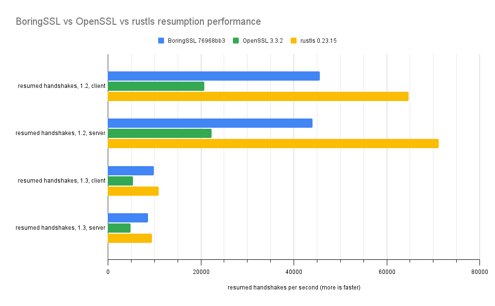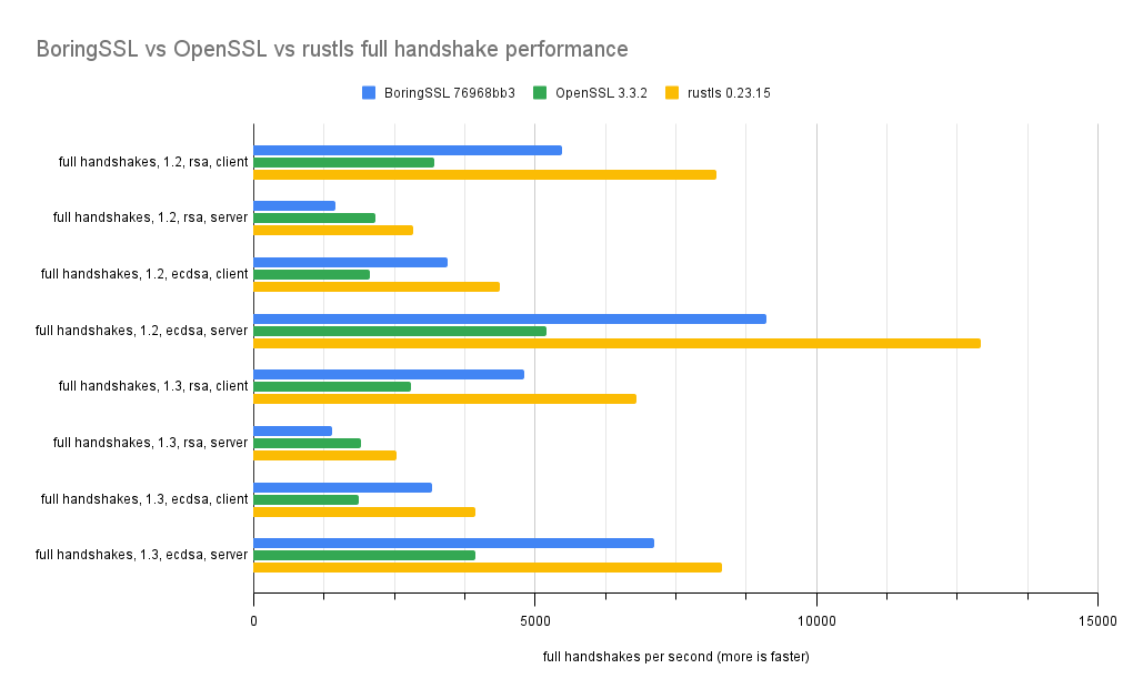 The first metric we'll look at is the number of handshakes that can be completed per second on the same hardware with the same resource constraints. These tests connect one client to one server over a memory buffer, and then measure the time elapsed in client and server processing — therefore, they give an upper bound on performance given no network latency or system call overhead.